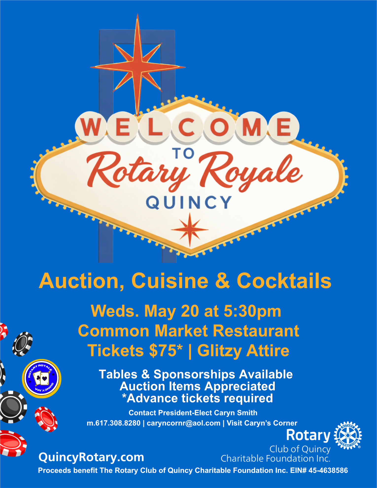 The Rotary Club of Quincy annual auction will be held on Wednesday, May 20th at 5:30 PM at Common Market Restaurant featuring a Las Vegas theme. Individual tickets are available for $75. Tables and sponsorships available. We are collecting donations for the silent and live auctions. Jim Fagan will emcee the event and if you’ve attended our auction in the past you can likely imagine the antics and entertainment attendees will experience.